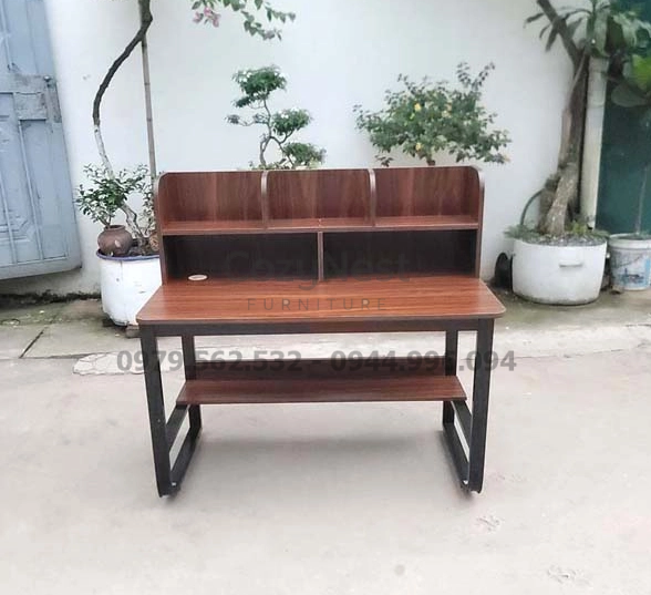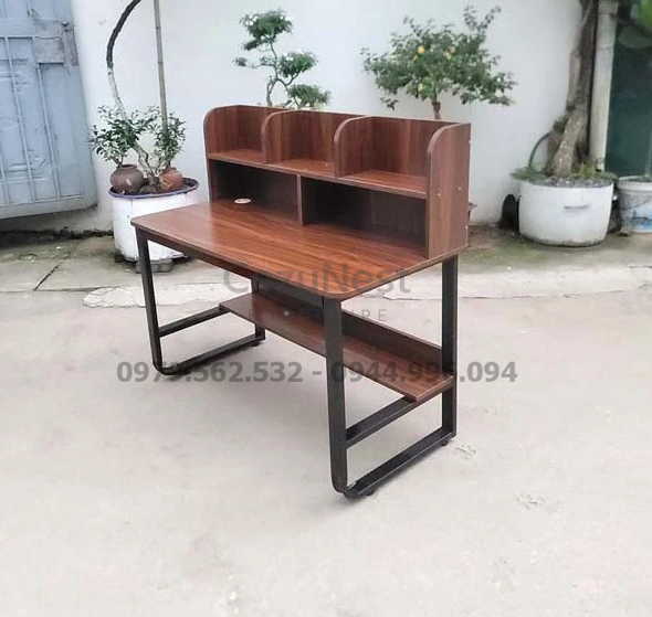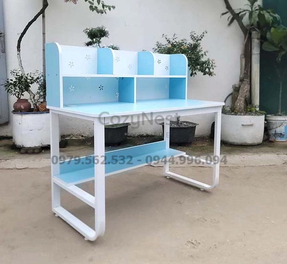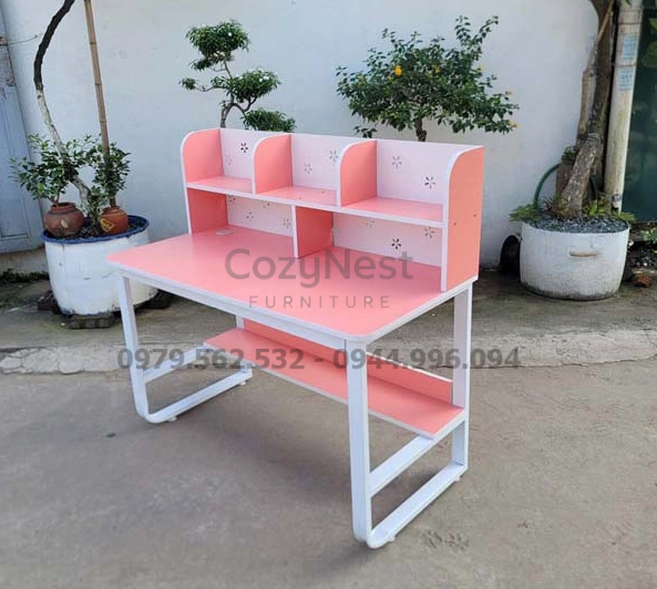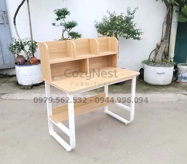 Phần giá sách được bố trí ngay trên bàn, cho phép người dùng dễ dàng sắp xếp sách vở, tài liệu hay đồ trang trí. Thiết kế này giúp góc học tập luôn gọn gàng, khoa học và thẩm mỹ.