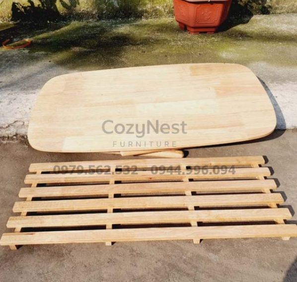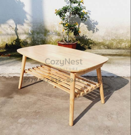 Mặt bàn được làm từ gỗ tự nhiên cao cấp, có màu sáng ấm và vân gỗ đẹp mắt, tạo cảm giác gần gũi, thân thiện. Chất liệu gỗ được xử lý kỹ giúp chống ẩm mốc, hạn chế cong vênh và dễ vệ sinh. Bề mặt bàn mịn, bền màu, có thể dùng làm bàn trà, bàn để sách báo hoặc trang trí lọ hoa nhỏ.
