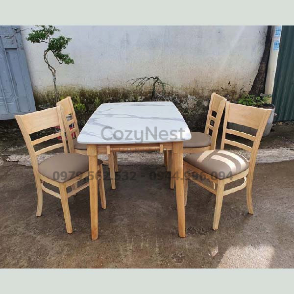 Khung bàn và ghế được làm từ gỗ tự nhiên chắc chắn, phủ lớp sơn bảo vệ giúp chống ẩm và hạn chế trầy xước. Mặt bàn phủ lớp chống thấm, dễ dàng vệ sinh sau bữa ăn, giữ cho bề mặt luôn sáng bóng và sạch sẽ. Điều này rất phù hợp với các gia đình bận rộn, muốn tiết kiệm thời gian chăm sóc đồ nội thất.